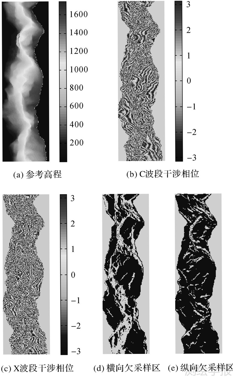 4 试验验证及分析 4.1 仿真数据首先,利用仿真DEM数据来验证本文提出的多频InSAR相位梯度重建算法的有效性。设仿真高程模型为陡峭多山地形,且InSAR系统采用编队飞行方式,由主卫星发射雷达信号,主、从卫星同时接收形成干涉图,该系统分别工作在C波段(载频5.39 GHz)以及X波段(载频9.65 GHz),其他主要系统参数如表 1。