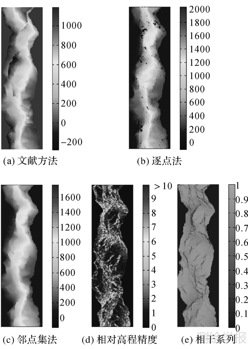 与文献[13, 21]中提出的利用多频InSAR数据直接进行高程估计的传统方法相比,本方法对各通道间绝对相位误差不敏感,因而可以在无控制点情况下完成相位梯度重建。相比之下,多频InSAR直接高程估计虽无需相位解缠,但必须通过定标手段来消除通道间的绝对相位误差,而且往往需要外部输入的粗精度DEM[13],才能取得比较理想的高程反演结果。