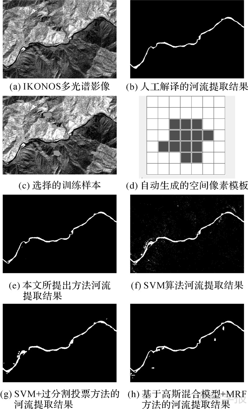 4.3 结果分析 4.3.1 IKONOS多光谱影像本幅遥感影像的场景为山区,影像中分布有明显的山体阴影,且其光谱值与河流存在一定的重叠。如图 3(c),选择一定数量的训练样本。利用第二部分介绍的特征选择方法自动生成空间像素模板,如图 3(d)所示。各种方法河流提取的结果分别如图 3(e)~(h)所示。