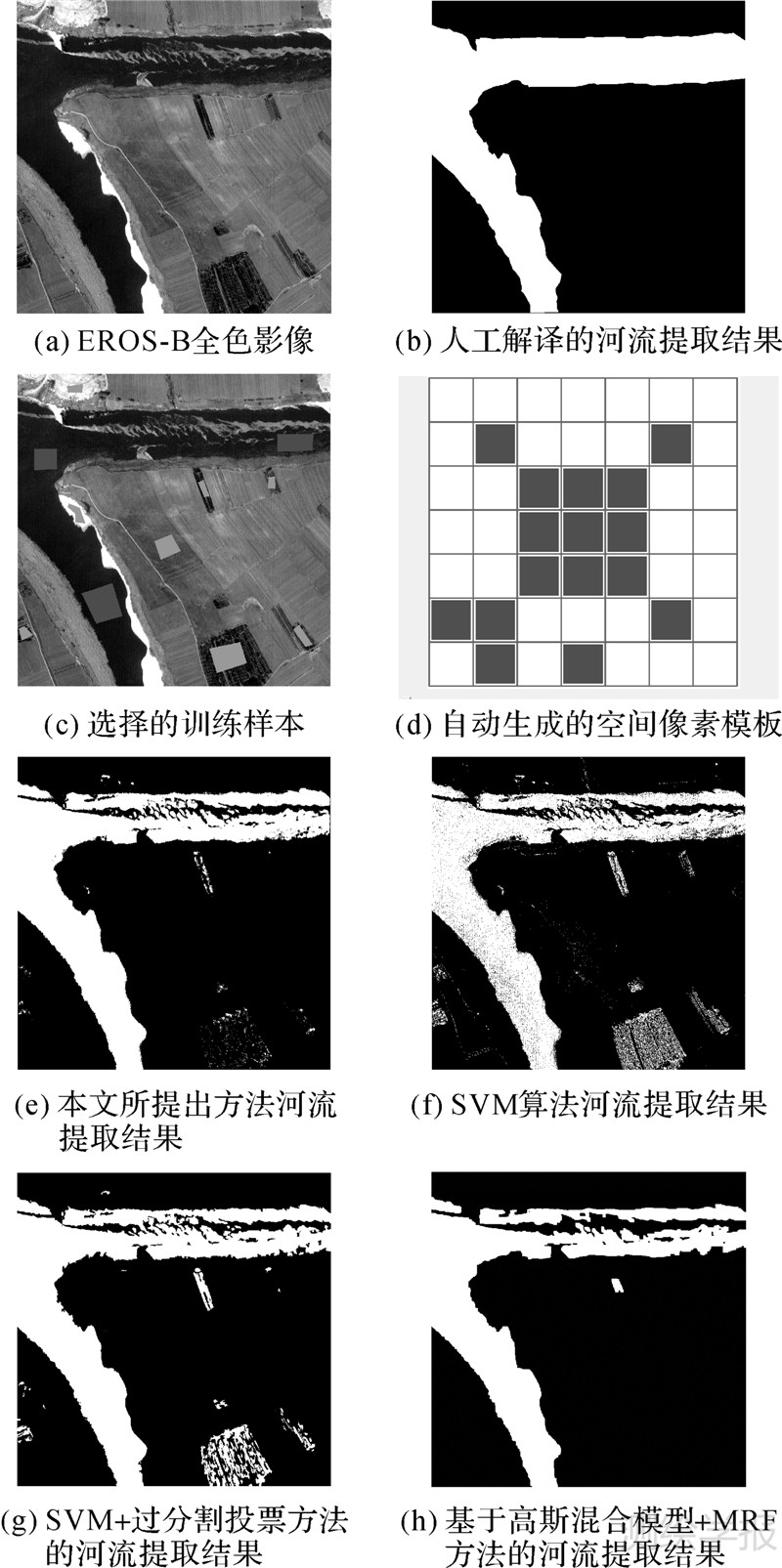 如图 4(c),选择一定数量的训练样本。根据特征选择方法自动生成空间像素模板,如图 4(d)所示。各种方法的河流提取的结果分别如图 4(e)~(h)所示。