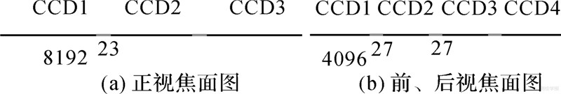 表 1详细列出了资源三号载荷信息。为了保证幅宽,资源三号三线阵相机和多光谱相机均采用多CCD拼接,图 1中为资源三号三线阵相机焦面简图,其中正视相机采用3片CCD拼接,重叠像素约为23个,前后视相机采用4片CCD拼接,重叠像素约为27个。