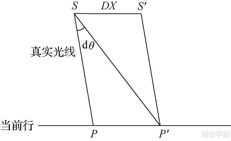 如图 2所示,S表示当前时刻卫星成像的真实位置,DX为卫星位置偏移误差。由图中几何关系,轨道误差DX可以等效成姿态误差dθ,两者对几何定位精度影响一致。另外,式(1)中,[Dx Dy Dz]T、[dx dy dz]T对几何定位精度的影响完全一致,可以合并成等效的相机坐标系原点偏移误差[ΔX ΔY ΔZ]T,依图 2原理等效为相机安装角误差,合并成等效的Rcamerabody。因而,通过引入正交旋转矩阵(偏置矩阵)RU补偿实际成像光线与理想成像光线的指向偏差,便可消除姿轨测量误差、测量设备及相机安装误差。当利用多检校场进行在轨几何检校时,对每景影像均需解求对应的偏置矩阵RU,即