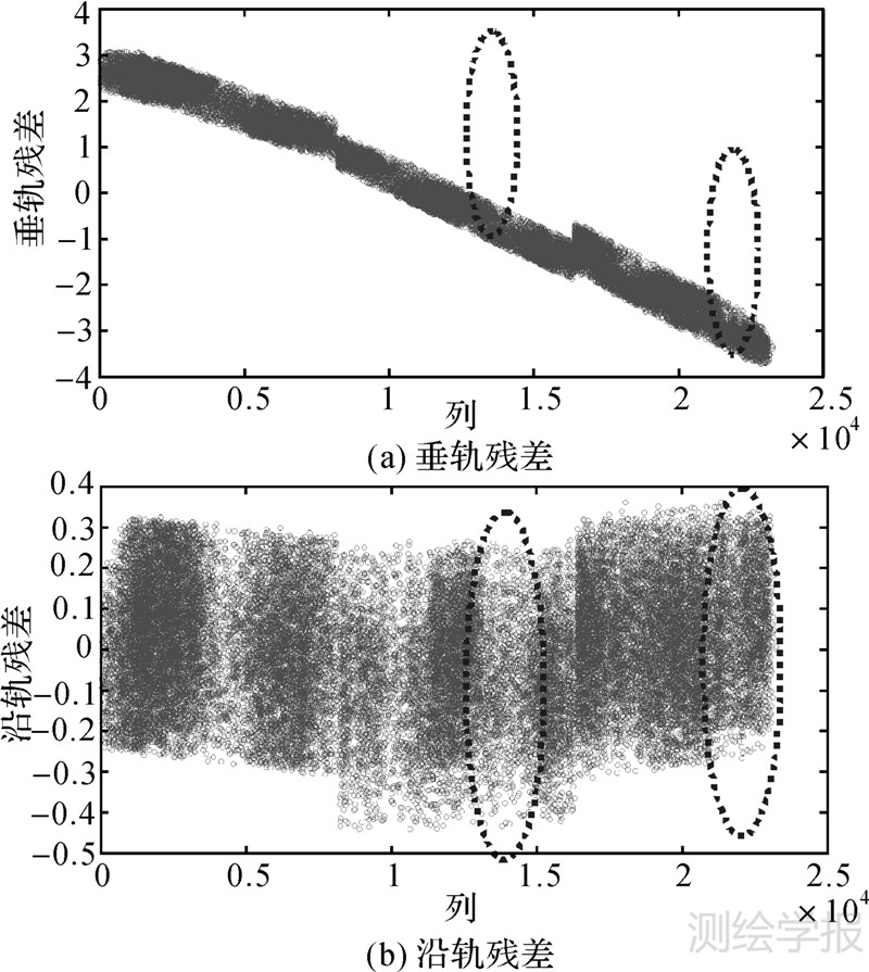 从表 2可知,通过偏置标定后,垂直轨道方向存在接近两个像素的误差。2012-02-03登封景正视影像解求偏置矩阵以后的残差图(前、后视影像规律一致)如图 5所示,其中横坐标为影像列,纵坐标为垂轨、沿轨残差。