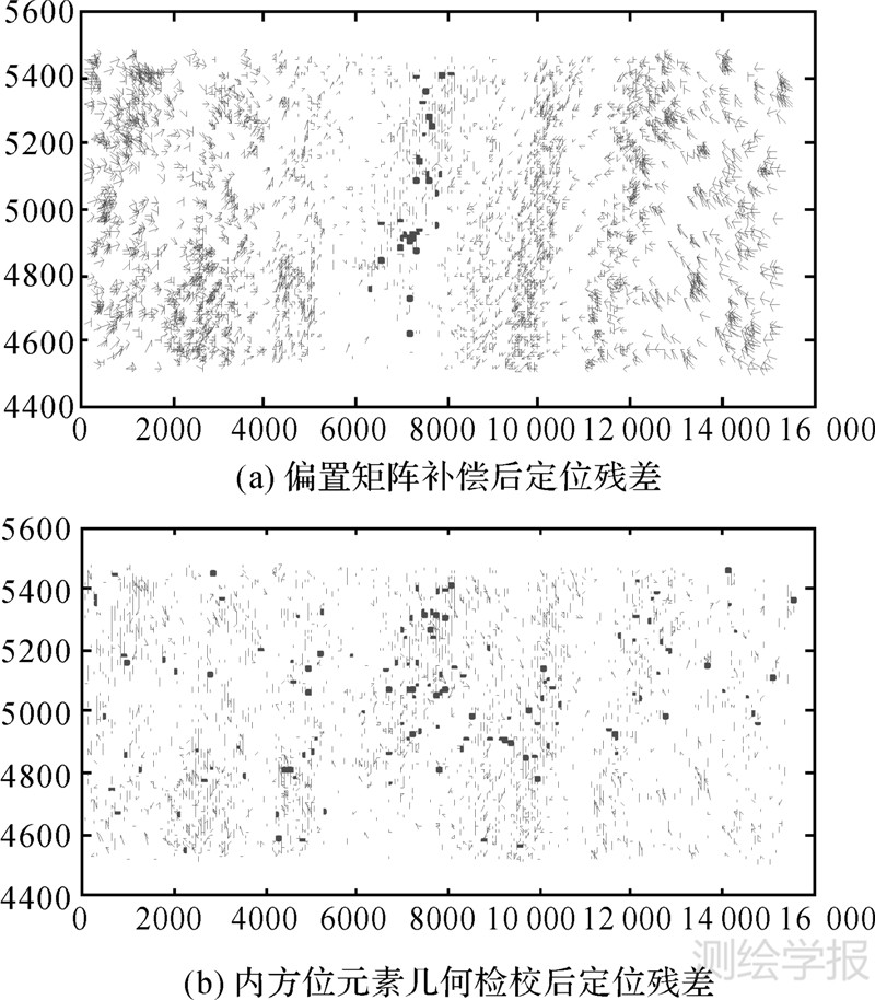 图 6为2012-02-03登封景几何检校后的定位残差图,从图 6(a)中可以看到,经过偏置矩阵解求后,定位残差图呈现“两边大、中间小”的趋势,具有一定的对称性;而图 6(b)中,进一步经过内方位元素几何检校后,残差不存在明显的畸变特性,分布随机。