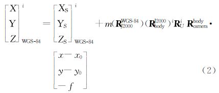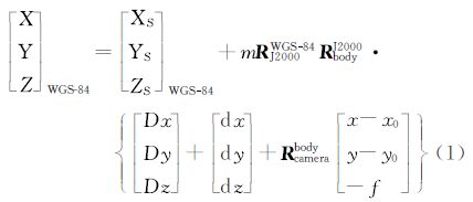 式中,m为成像比例;[Xs Ys Zs]T为成像时卫星在WGS-84系下的位置矢量;[X Y Z]WGS-84T为影像点对应的WGS-84系下的物方点坐标;Rcamerabody是由相机在本体坐标系下的安装角确定的转换矩阵;RbodyJ2000是由定姿设备(星敏或陀螺)测量处理得到的本体坐标系与J2000坐标系转换矩阵;RJ2000WGS-84为J2000坐标系相对WGS-84坐标系的转换矩阵;[Dx Dy Dz]T、[dx dy dz]T分别为GPS相位中心在本体坐标系中的偏移及相机坐标系相对本体坐标系的原点偏移;(x0,y0,f)为主点、主距表示的内方位元素。式(1)能最为精确地表达资源三号卫星三线阵相机成像几何,但却由于模型参数相关性,不适宜作为用于几何检校的严密成像几何模型。