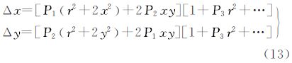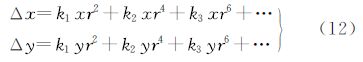 因s1xy与s0xy仅存在坐标平移关系,则s探元的像主点坐标为 比较式(8)与式(10)可知 2.2.5 镜头光学畸变镜头光学畸变主要包括径向畸变及偏心畸变[21, 22, 23]。其中径向畸变模型为