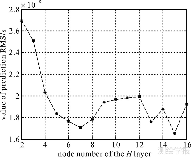 下面任选一颗导航卫星某段时间的钟差进行预报建模,分析H层神经元个数的不同对WNN模型预报结果的影响情况(这里使用GPS系统的PRN 02卫星,数据条件同试算结果一)。图 3给出了H层单元数从2到16变化时钟差预报结果的RMS变化情况。从图中试验结果中可以发现,当H层神经元数量达到5个以后,在接下来的一定范围内改变H层单元数时预报结果的变化不明显,特别是预报结果的精度都不理想(参考下一部分实算中的对比情况)。但是,从理论上分析应该存在一个合适的H层单元数可以满足钟差的高精度预报,而这需要进一步构造更加复杂的网络结构和进行更多的试验。为了避免这种情况,本文使用钟差历元间一次差的序列进行预报然后还原预报结果从而取得了较好的预报效果(下一部分做具体分析)。最终,结合试验确定本文的WNN模型H层神经元个数为6个。