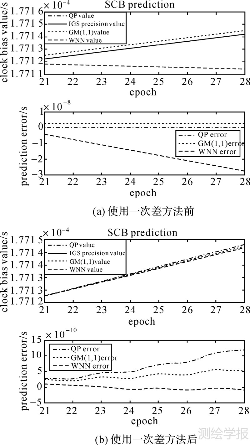 从表 3可以看出,使用一次差方法可以明显改善WNN模型的稳定性和预报精度,使其预报效果明显优于两种常用模型。同时还可以看出使用较多钟差数据建模时,一次差方法可以一定程度上提高GM(1,1)模型的预报精度.