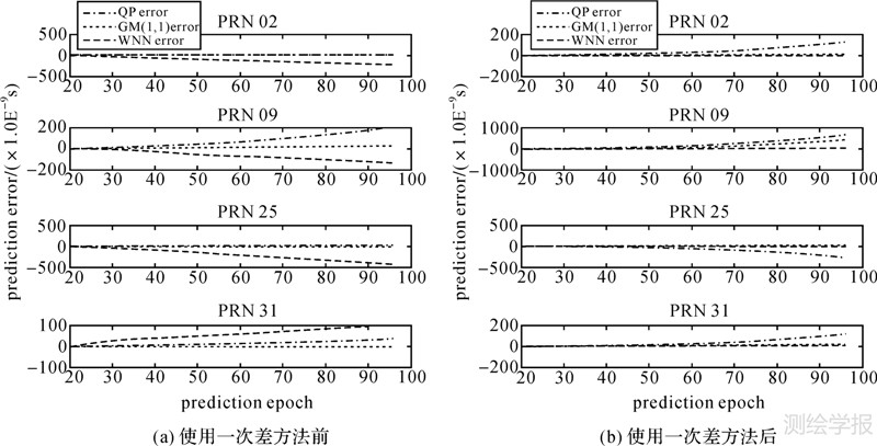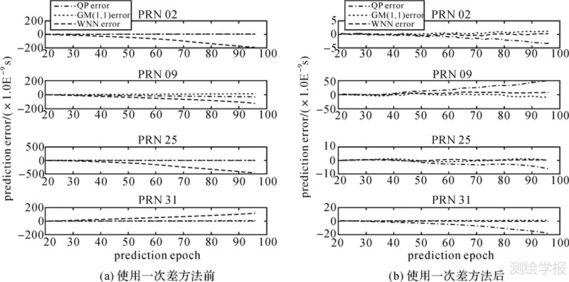 最后,对各模型使用一次差方法时表现出的特点进行分析说明:由于使用的是IGS提供的精密钟差数据,其钟差序列自身误差很小,但是经过数据的一次差处理和预报后的钟差还原,根据误差传播定律可知道,这样会使预报结果所含的误差变大,特别对于QP模型来说,这种影响非常明显。而对于GM(1,1)模型来说,模型本身具有一定的抗干扰能力,同时该模型建模时就要对数据序列进行自加和最后自减,因此该模型在使用一次差方法前后的预报性能难以给出定性的结论。然而对WNN模型来说,使用一次差方法时其钟差预报效果比不使用时得到了明显提高,一方面是因为该模型自身就有一定的抗差性,另一方面说明在网络拓扑结构一定的情况下,由原钟差序列有效数位太多引起的WNN模型难以较好地拟合钟差模型造成的预报误差远大于由相邻历元作差对建模所造成的预报误差。值得一提的是,如果钟差预报模型建模时,所使用的钟差数据含有一定的系统误差,则本文提出的基于一次差方法的钟差预报模型会得到更好的预报效果。