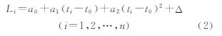 式中,Li是ti时刻GPS卫星钟的钟差;t0为星历表参考时刻;ti表示历元时刻;待估参数a0、a1和a2分别表示参考时刻t0的卫星钟差、钟速及卫星钟的频漂。当n > 3时,依最小二乘法则可求解得到