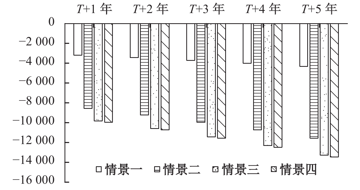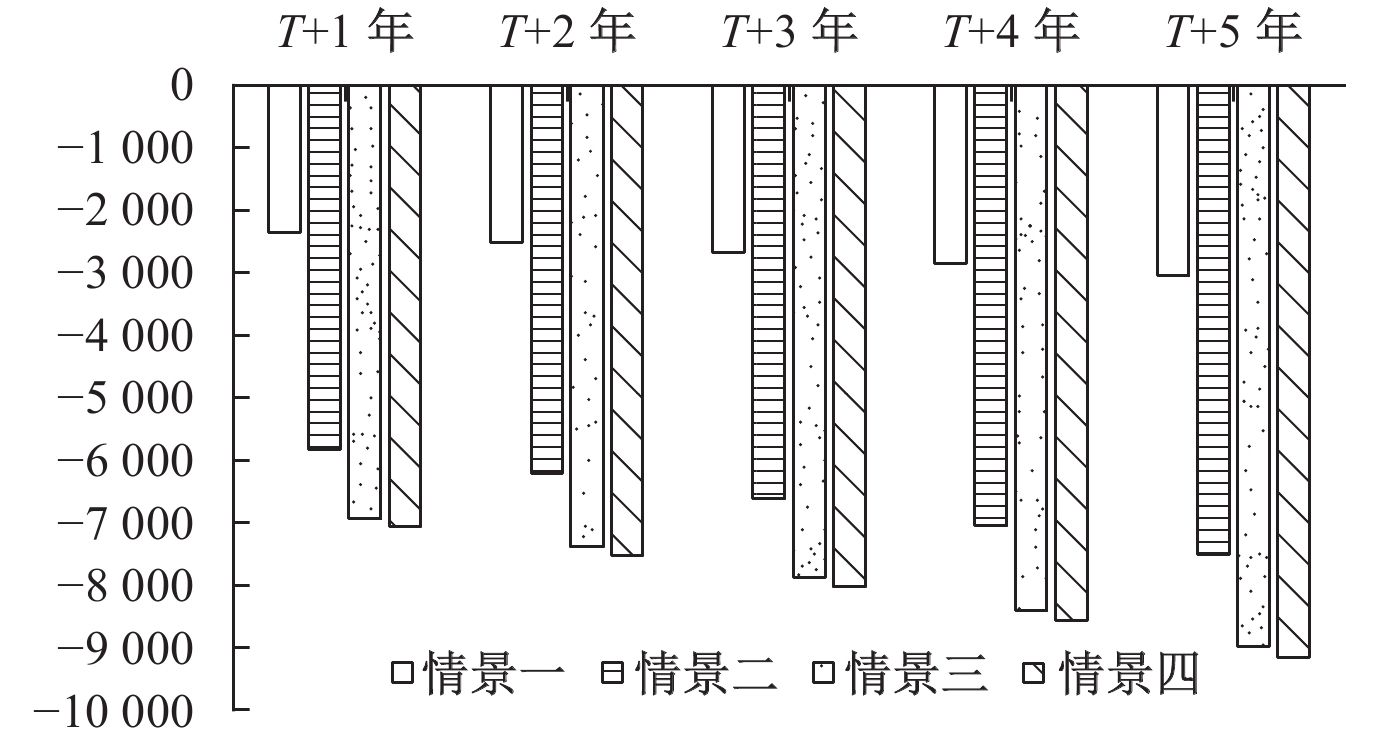 | 图 3 各模拟情景中全国财政收入相对于基期的减少金额(单位:亿元) |