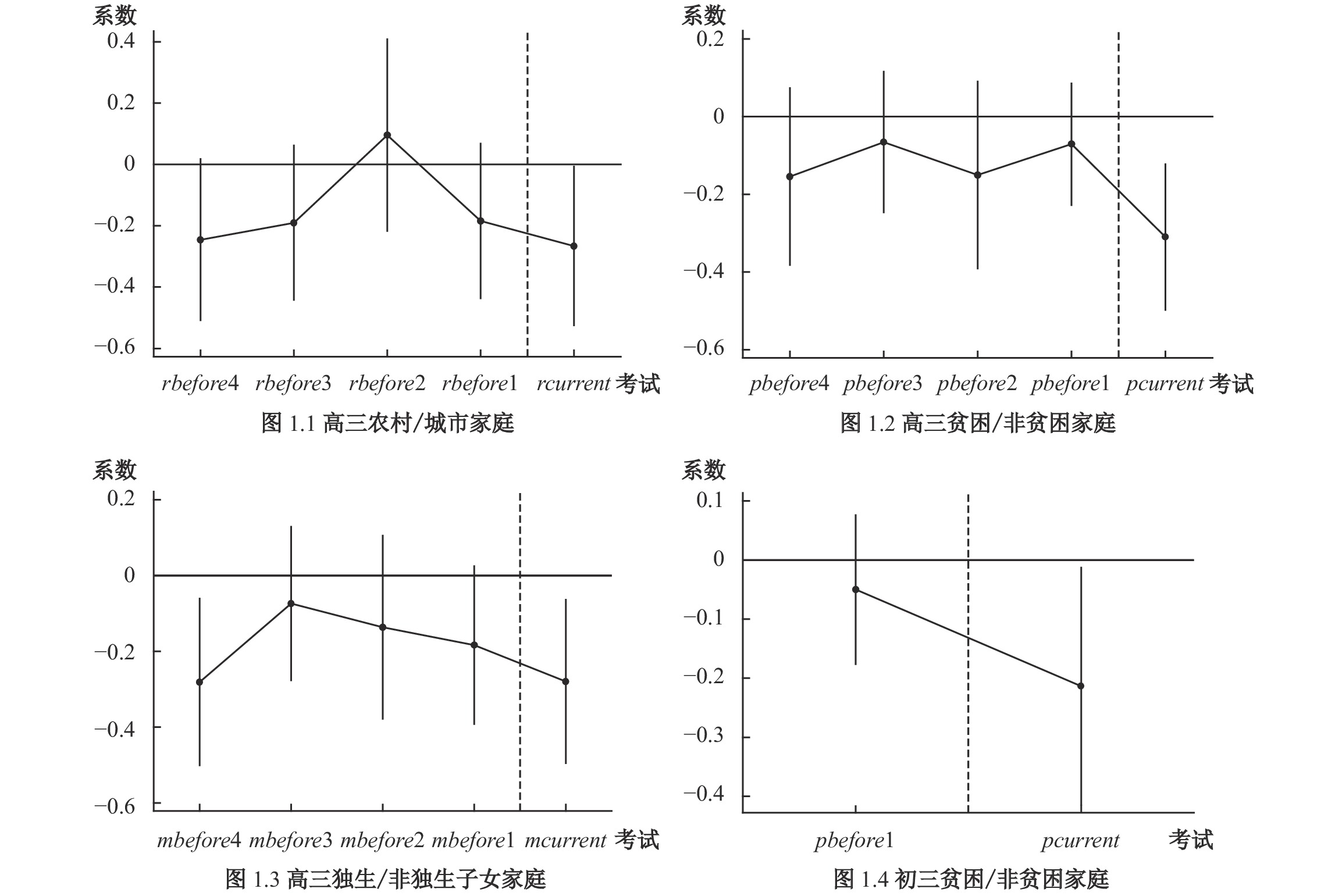 对于高三年级样本,图1的1.1至1.3分别在家庭所在地、贫困与否和独生子女与否三种条件下,报告了不同冲击时点