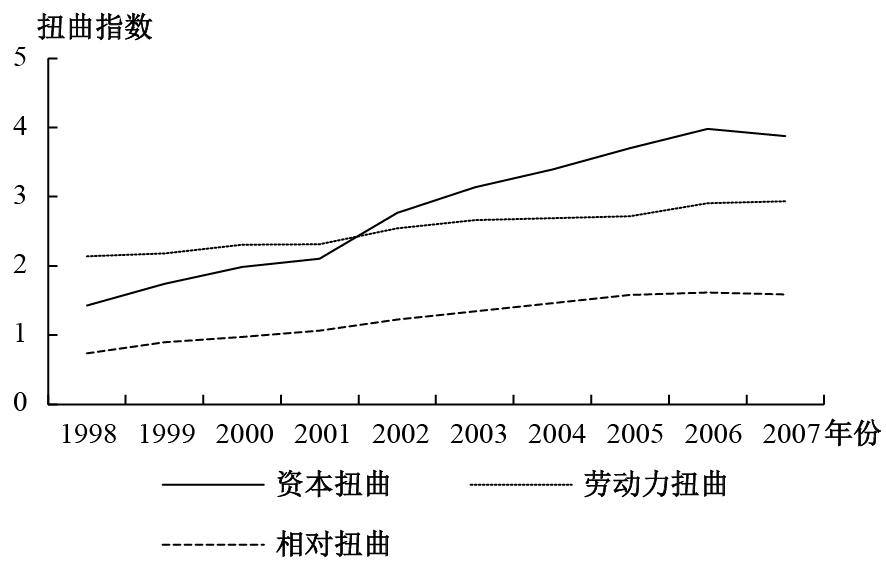 通过将资本和劳动力的边际产出与其实际的价格相比,即可得出资本价格扭曲、劳动力价格扭曲和要素价格相对扭曲: