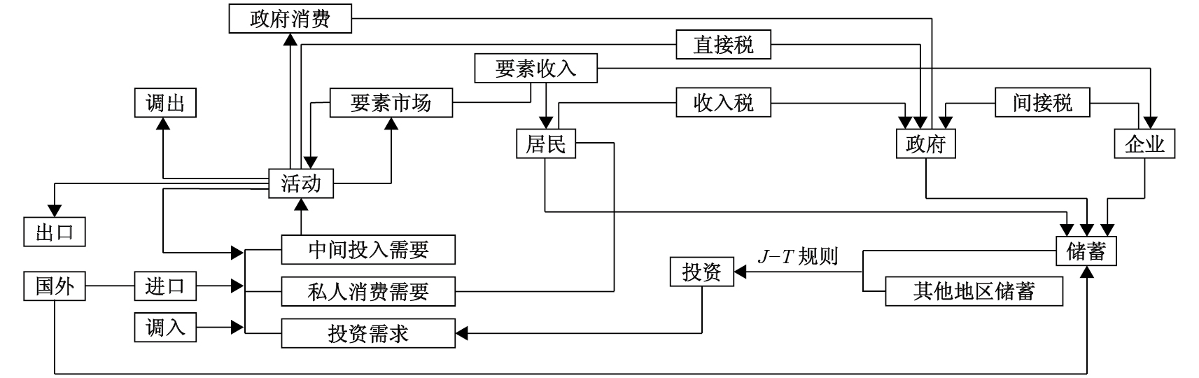 (二)收入、储蓄及需求模块。居民和企业是生产活动中资本和劳动要素的提供者,要素报酬按一定比例分配给居民和企业。政府通过向生产者征收直接税,向居民和企业征收所得税获取收入,税率外生。居民收入以固定份额形成储蓄。企业收入全部用于储蓄。政府收入扣除政府消费形成政府储蓄。国外部门在各地区的储蓄为各地区进口额与出口额的差额。各地区居民、企业、国外部门和政府的储蓄形成全国总储蓄。