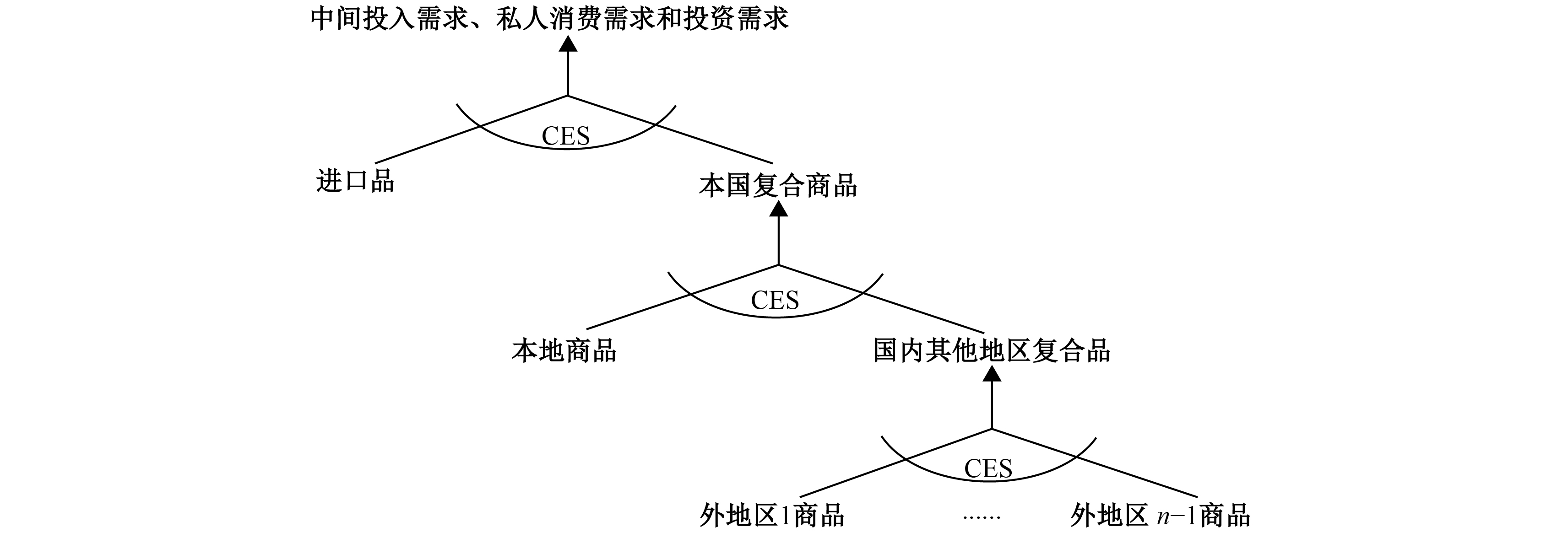 (三)贸易及区域间商品流动模块。各地区的居民消费需求、中间投入需求和投资需求既可由本地生产的商品满足,又可由进口品和外地调入品满足,以CES函数描述他们之间的替代关系,如图2所示。CES上两层嵌套的是两种商品的复合,其CES函数形式和需求者选择的最优化方程推导和生产模块中完全一致,这里不再赘述。以私人需求为例,最下层的多种商品复合的CES方程为:
