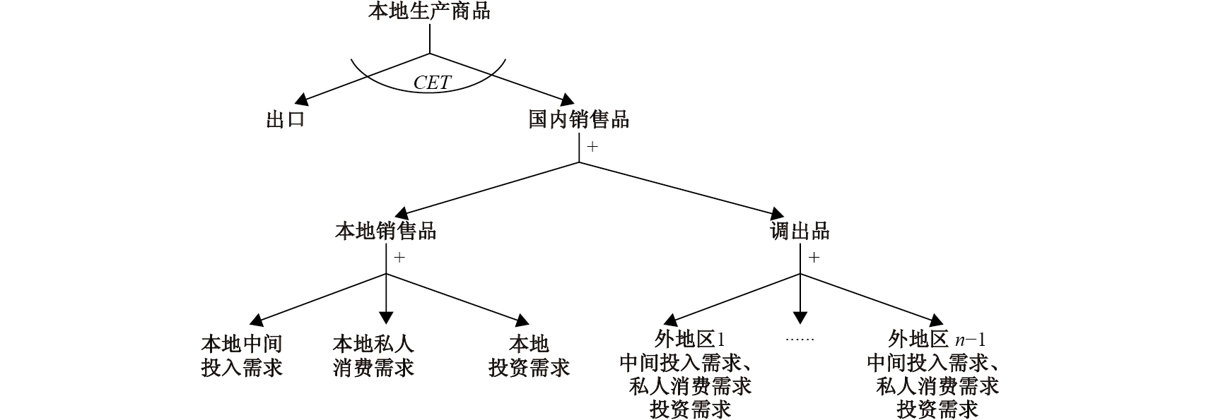 本文模型的供给结构反映本地生产产品在出口、本地销售和国内其他地区销售之间的关系。逻辑关系见图3所示。各地区在生产活动中产出的产品在国外和国内销售,以CET函数反映两者间的替代关系。其方程为: