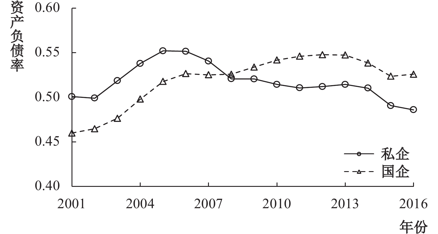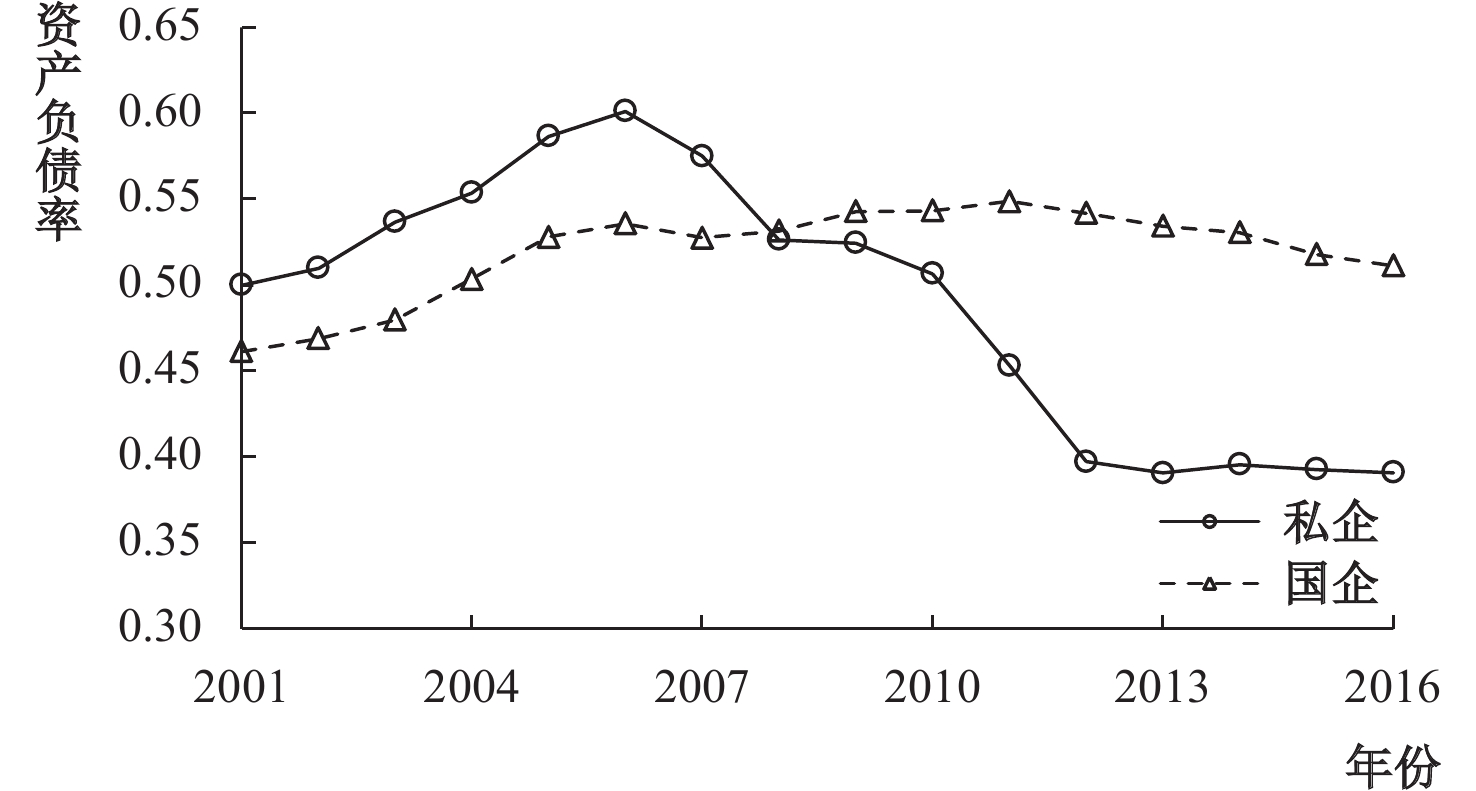 在企业部门内部,债务水平和杠杆率的变化存在明显的结构性特征(钟宁桦等,2016)。从资金供给角度看,我国企业的融资主要依赖银行信贷(Allen等,2005),而银行信贷在国企与私企之间的分布却不均衡(卢峰和姚洋,2004)。①之所以产生偏向国企的不均衡分布,主要有三个原因:第一,为了扶持国企发展和维护社会稳定,政府往往会以优惠贷款的形式补贴国企(Bailey等,2011)。第二,与私企相比,国企在自身禀赋和信息成本②方面具有优势(方军雄,2007)。第三,政府隐性担保使国企还在违约风险上存在优势(袁淳等,2010)。私企可获得的信贷资源被严重挤出,受到的融资约束程度显著高于国企(刘瑞明,2011;邓可斌和曾海舰,2014)。2008年以来,面对全球金融危机的冲击,我国经济结构开始转型,宏观经济增速进入下行轨道,企业投资机会减少,违约风险逐渐上升。这很可能会进一步加剧信贷资源向国企的倾斜。一方面,理论与实证文献都表明,政府在经济下行和危机发生时会增加对国有银行的干预,以减小信贷的周期性波动,维持经济增长和社会稳定(Behr等,2017);另一方面,对风险厌恶的银行而言,经济下行和宏观风险上升会导致政府隐性担保的价值增加,使其更倾向于为国企提供融资(Borisova等,2015)。私企的融资环境则可能进一步恶化,债务融资难度增大,其杠杆率被迫下降。