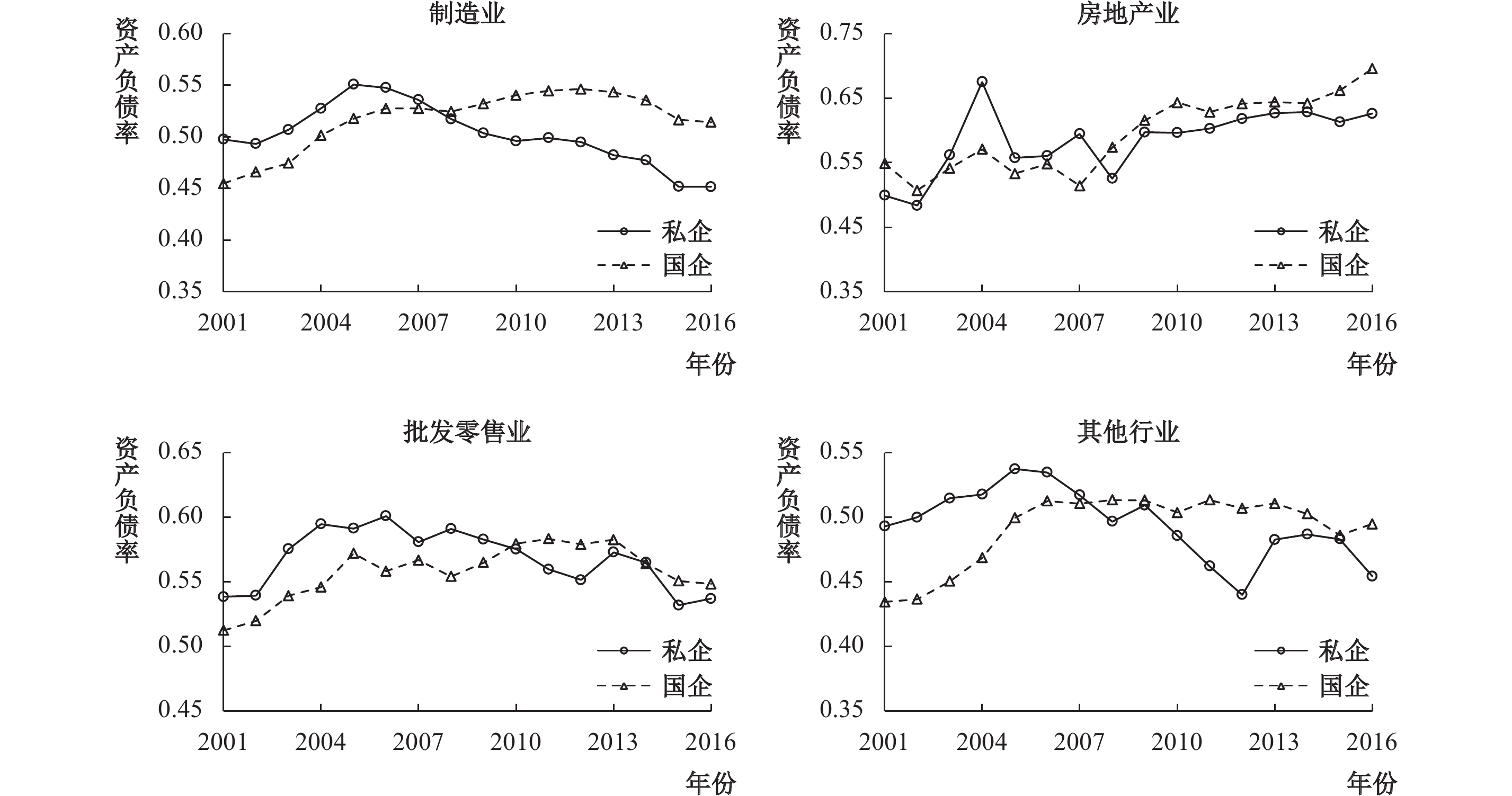 国企与私企在行业分布上的差异也可能干扰我们对于杠杆率相对变化的判断。具体来说,我国国企大多分布在以制造业为主的上游行业,而私企则分布在服务业为主的下游行业,呈现出“垂直结构”(Li等,2015)。因此,杠杆率的相对变化可能反映的主要是杠杆率的行业差异,而并非所有制差异。为了排除这一潜在问题,我们将样本分为制造业、批发零售业、房地产业和其他行业四个子样本,各个子样本中国企和私企杠杆率的变化情况见图3。从中可以看出,不同行业间企业杠杆率的绝对大小和变化趋势存在差异,但各个行业内国企的杠杆率相对于私企总体上都呈现出上升的趋势。换言之,国企和私企杠杆率剪刀差的逆转在考虑了行业分布的差异之后依然存在。