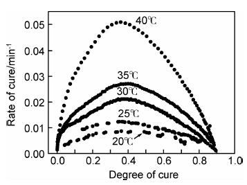![]() | 图3 硫化速率与硫化程度的关系 Fig.3 Rate of cure dα/dt versus degree of cure α | |
