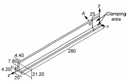 本实验采用一端固支悬臂梁的自由振动衰减法测量T型梁模态性能,振动模式为y向弯曲振动,实验环境温度为室温。实验装置示意图如图3所示。用力锤在激振点沿y方向激振,力锤上的力传感器感受的力信号经电荷放大器放大后输入到数据采集仪的1 号通道,同时加速度传感器测量的加速度响应信号经电荷放大器放大后输入到数据采集仪的 2 号通道,再由Vib′SYS模态分析软件进行分析计算,得到频率响应函数。本次实验还选取了不同的激振点进行测试,A点(图2)和B点为所选取的不同的激振点,其中A点位于远离腹板一侧的肋板平面上,B点位于腹板外侧沿Z轴的中心线上,且它们都距T型梁的顶端245mm,如图3所示。在实验中分别采用单点激励单点响应和单点激励多点响应的方法。