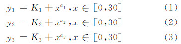 式中:y1,y2,y3分别为平纹、斜纹和纬平针织物的内部环境温度;K1,K2,K3为常数项;a1,a2,a3为幂值;x为时间。