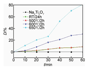 2.4 光催化性能的研究图5为不同样品的光催化降解曲线图。可知,钛酸钠纳米线在紫外光条件下对甲基橙溶液几乎没有光催化降解作用,而随着烧结温度的提高,样品对甲基橙溶液光催化降解率逐渐提高,烧结温度为650℃时光催化性能最强,在1h内对甲基橙溶液的降解率可达到83%。