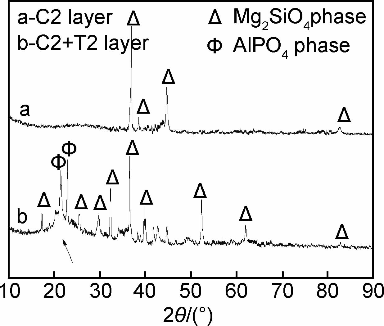 2 结果与分析 2.1 取向硅钢表面绝缘涂层的物相及结构分析分别将涂有C2底层的硅钢片和涂有C2+T2涂层的硅钢片中的涂层刮下,制成粉末,采用XRD分析其物相组成,如图1所示。由图1可知,C2底层的物相组成为Mg2SiO4。Mg2SiO4相是由高温退火时,涂覆的氧化镁隔离剂与硅钢在脱碳退火(840℃)过程中形成的SiO2反应形成的,即2MgO+SiO2→Mg2SiO[7]4。取向硅钢表面绝缘涂层(C2+T2)的物相组成为Mg2SiO4和AlPO4相。其中,Mg2SiO4相来源于C2底层,这与图1中的Mg2SiO4相相符合,AlPO4相是由磷酸盐在820℃下脱水转化形成的。此外,在2θ=18°~28°处存在一个散漫的“馒头峰”,如图1中箭头所示,该“馒头峰”可能是由于T2涂液中的硅溶胶脱水转变成玻璃态,从而导致其在XRD图谱中出现[17]。