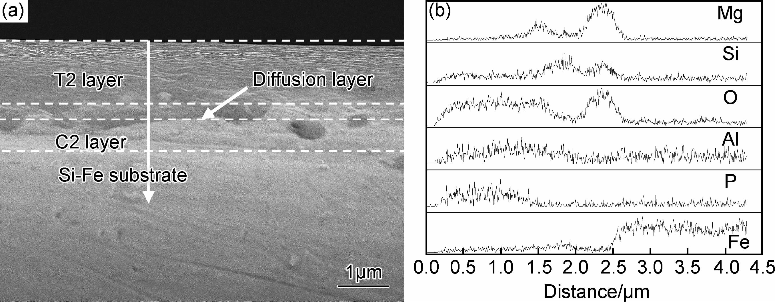 3 结论(1) 取向硅钢表面绝缘涂层是由T2顶层与C2底层组成的双层复合结构,T2顶层和C2底层的物相分别为AlPO4相与Mg2SiO4相,T2顶层与C2底层的厚度分别为1.4μm和0.8μm,两个涂层的结合处存在0.4~0.6μm厚的扩散层。