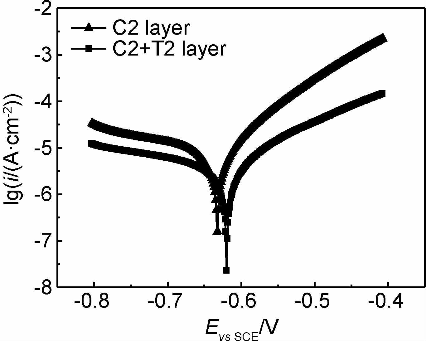 (2) 在C2底层上涂覆T2顶层后,腐蚀电位提高了0.013V,从热力学上抑制了取向硅钢的腐蚀倾向;同时,腐蚀电流密度减少了41.6%,从动力学上降低了取向硅钢的腐蚀速率。因此,T2顶层可以有效地提高取向硅钢的耐腐蚀性能。