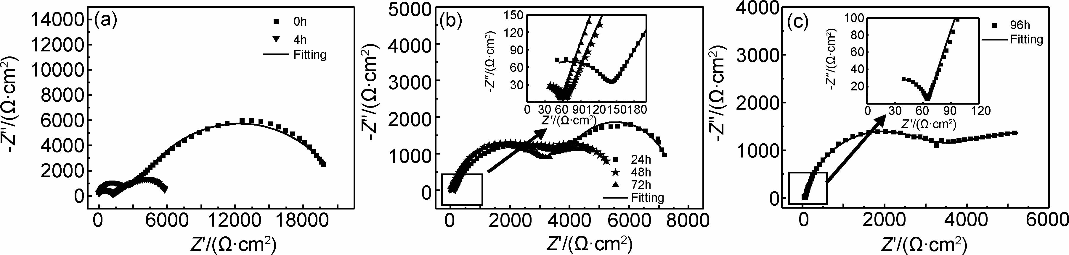 当试样在3.5% NaCl溶液中浸泡至96h时,如图4(c)所示,在低频区出现了与扩散有关的半无限Warburg阻抗。一般认为Warburg阻抗表征在涂层的孔隙中,出现了腐蚀产物的扩散传质过程[18]。