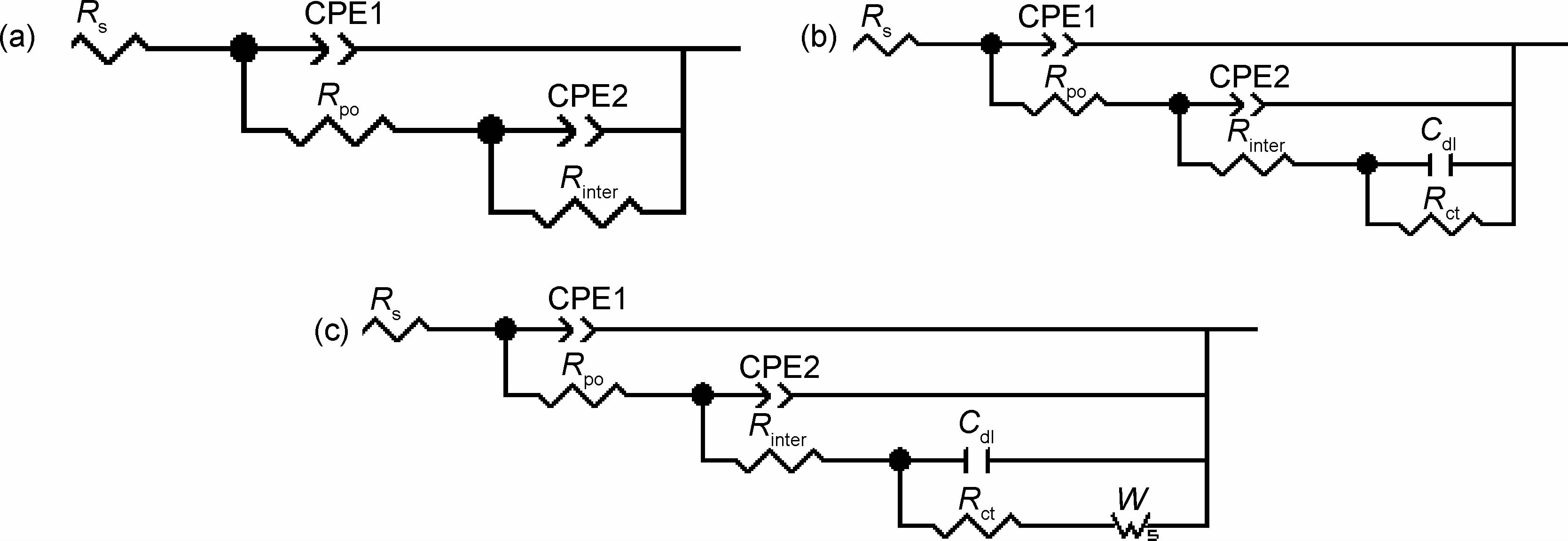 ![]() | 图6 不同浸泡时间下EIS的等效电路图 (a)0,4h;(b)24,48,72h;(c)96h Fig.6 Equivalent circuits for EIS with different immersion time (a)0,4h;(b)24,48,72h;(c)96h | |