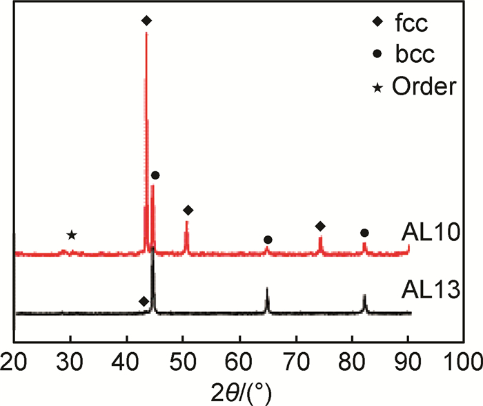 图 2为AL10, AL13合金的X射线衍射图。从图中可以看出,随着Al含量的增加(见表 1),合金中体心立方相(bcc)越来越多,面心立方相(fcc)逐渐被取代,这是因为Al元素原子半径大,进入面心立方晶格,促使晶格发生畸变,部分原子被挤出,得到新的晶格形式,即体心立方[11]。XRD结果显示,在2θ=30°左右处,出现了少量的有序固溶体相。这是由于合金铸造过程中,原子间的扩散迟滞以及不同元素原子间具有不同的吸引力[12],导致在很小的区域,某些原子更易结合,形成有序固溶体。