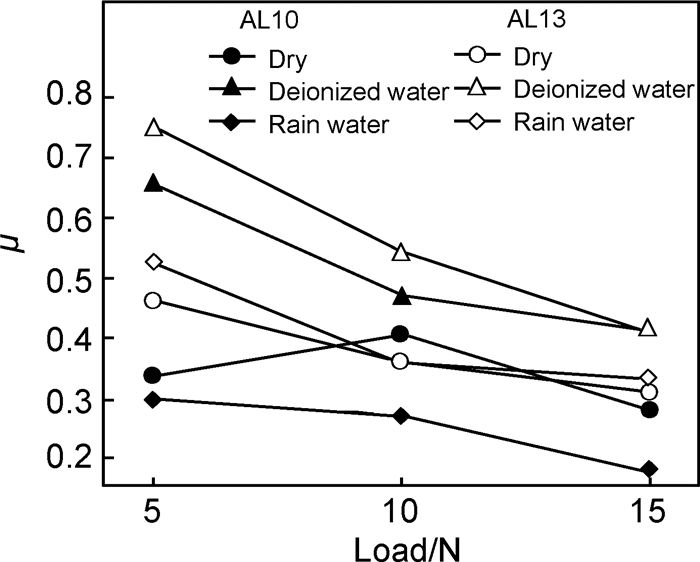 图 3为AL10,AL13在不同环境和载荷耦合作用下的摩擦因数平均值折线图(实心图标为AL10,空心图标为AL13)。整体趋势随载荷的增大而减小,这是因为随载荷的增大,摩擦副之间接触面积变大。根据机械-分子理论[13]: