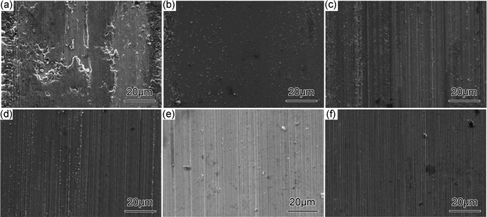 图 4 载荷10N时,不同条件下两种材料磨痕形貌 (a)AL10合金,干磨;(b)AL13合金,干磨;(c)AL10合金,去离子水;(d)AL13合金,去离子水;(e)AL10合金,雨水;(f)AL13合金,雨水 Fig. 4 Morphologies of wear scar at 10N under different conditions (a)AL10, dry; (b)AL13, dry; (c)AL10, deionized water; (d)AL13, deionized water; (e)AL10, rain water; (f)AL13, rain water |