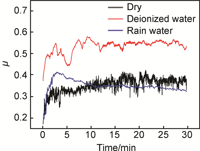 AL13合金在载荷为10N时的摩擦因数曲线,如图 6所示。可以发现,去离子水中摩擦因数值明显高于干摩擦和雨水条件下的摩擦因数值。在液体环境中,摩擦因数曲线相对平缓,干摩擦下,摩擦因数波动剧烈。这主要是因为在液体环境中,表面完整有水膜覆盖,水分子填充表面微凹坑,减小了摩擦时的表面粗糙度。液体介质对表面产生的磨屑起到了冲刷作用,使磨痕表面更加平滑[18]。另外,在液体介质中摩擦,大量摩擦热被液体吸收,减小了由摩擦热引起的表面破坏作用。而干磨条件下,表面磨屑堆积,表面粗糙度增加,使得摩擦系因波动振幅明显增大。同时,表面磨屑的残留,使得摩擦行为变为三体磨损,产生的磨屑对表面产生进一步破坏,从而增大了摩擦损失,表现出较差的磨损性能[19]。