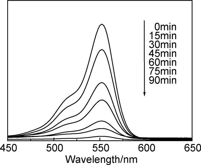 在可见光照射下,利用AAC-x复合物降解RhB水溶液表观速率常数k来评价其光催化性能。图 5为AAC-x复合物和g-C3N4降解RhB水溶液的表观速率常数k对比图。可以看出,制备的AAC-20复合物(k=35.32×10-3min-1)显示出最高的光催化活性。AAC-20复合物降解RhB水溶液吸光度随照射时间变化结果如图 6所示。观察到在552nm的吸收峰会随着光照时间的延长慢慢降低。并且在可见光下照射90min后,超过96%的RhB被降解。