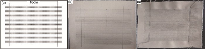 图 2 镀银纱线加热织物制备 (a)电路设计图;(b)在织物上画出镀银纱线排列;(c)加热织物 Fig. 2 Fabrication of heating fabric based on silver coated yarns (a)design diagram of circuit; (b)draw the arrangement of silver coated yarns on the fabric; (c)heated fabric |