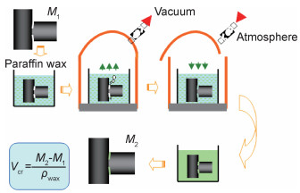 本工作利用式(3)预测镁合金热裂敏感性,并通过裂纹体积实验测定方法[22]对预测结果进行验证,如图 3所示。试样的初始质量为M1,将试样浸入盛有熔融石蜡的装置中,使石蜡在真空下填充热裂纹。设充满石蜡的试样的质量为M2,利用公式Vcr=(M2-M1)/ρwax可测定热裂纹的体积。其中,Vcr为裂纹体积,ρwax为石蜡密度。
