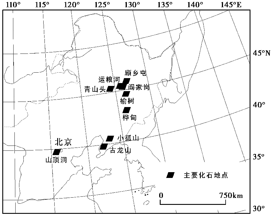 据研究资料[23, 33, 34, 35, 36, 37, 38, 39, 40, 41, 42, 43, 44, 45],距今40~10ka前,东北及相邻地区主要化石点从早到晚依次有顾乡屯 (40ka B.P.)[23, 33]、桦甸仙人洞(34.3 ka B.P.)[34]、榆树(30 ka B.P.)[23, 44]、小孤山(30 ka B.P.)[23, 37]、阎家岗(22ka B.P.)[23, 38]、山顶洞(18 ka B.P.)[23, 45]、古龙山(17 ka B.P.)[23, 39]、运粮河(14 ka B.P.)[23, 38]、青山头(11ka B.P.)[23, 40]等地点(图1)。