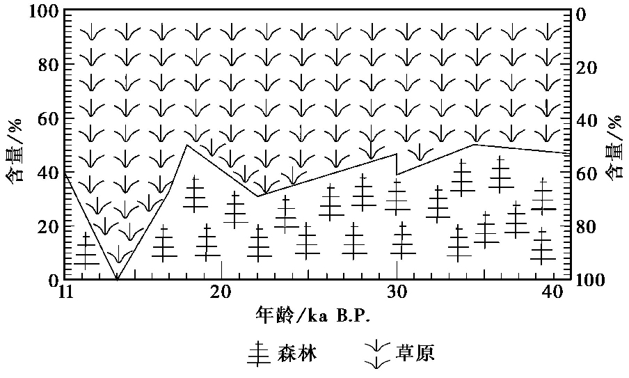 在40ka B.P. 、 30ka B.P. 和18ka B.P. 时,森林型动物较多,如Stephanorhinus kirchbergensis、 Sus scrofa、 Moschus moschiferus、 Moschus sp.、 Cervus hortulorum、 Cervus elaphus xanthopygus、 Cervus(Sika)grayi、 Megaloceros ordosianus、 Alces alces、 Capreolus manchuricus和Rangifer tarandus等组成,并伴有一定的沼泽型动物; 在34.3ka B.P. 、 22ka B.P. 、 17ka B.P. 和11ka B.P. 变为疏林型草原为主,如Bison(Parabison)exiguus、 Bos primigenius、 Bos taurus、 Bos sp.、 Procapra przewalskii、 Pachygazella sp.、 Spirocerus kiakhtensis、 Naemorhedus goral、 Ovis ammon、 Equus hemionus、 Equus dalianensis、 Equus przewalskii和Equus sp. 等; 在14ka B.P. 森林和疏林型草原全部消失,只有苔原和草原型动物,如Mammuthus primigenius、 Coelodonta antiguitatis、 Equus dalianensis、 Bison(Parabison)exiguus和Equus przewalskii等。到大约11ka B.P. 的青山头动物群,虽然也仅有5种动物,与前边的运粮河动物群(大约14ka B.P. )却截然不同: 不但少了苔原动物,同时还增加了森林类型,应该是气候环境发生明显变化的结果。当然这个动物群的属种数确实太少,我们也期待着更多的化石发现来进一步验证或补充我们目前所做的分析。大型食草类动物组成(见表1)的上述变化似乎表明东北及相邻地区晚更新世晚期距今40~10ka前,即末次冰期极盛期前后在冻土苔原大背景下可能经历了40ka B.P. 森林草原、 34.3ka B.P. 疏林草原、 30ka B.P. 森林草原、 22ka B.P. 疏林草原、 18ka B.P. 森林草原、 17ka B.P. 疏林草原、 14ka B.P. 无树干草原及11ka B.P. 疏林草原的变化过程。统计森林型、 草原型动物所占比例( 表2)并作图( 图2),可以看到更为清晰的环境变化过程。