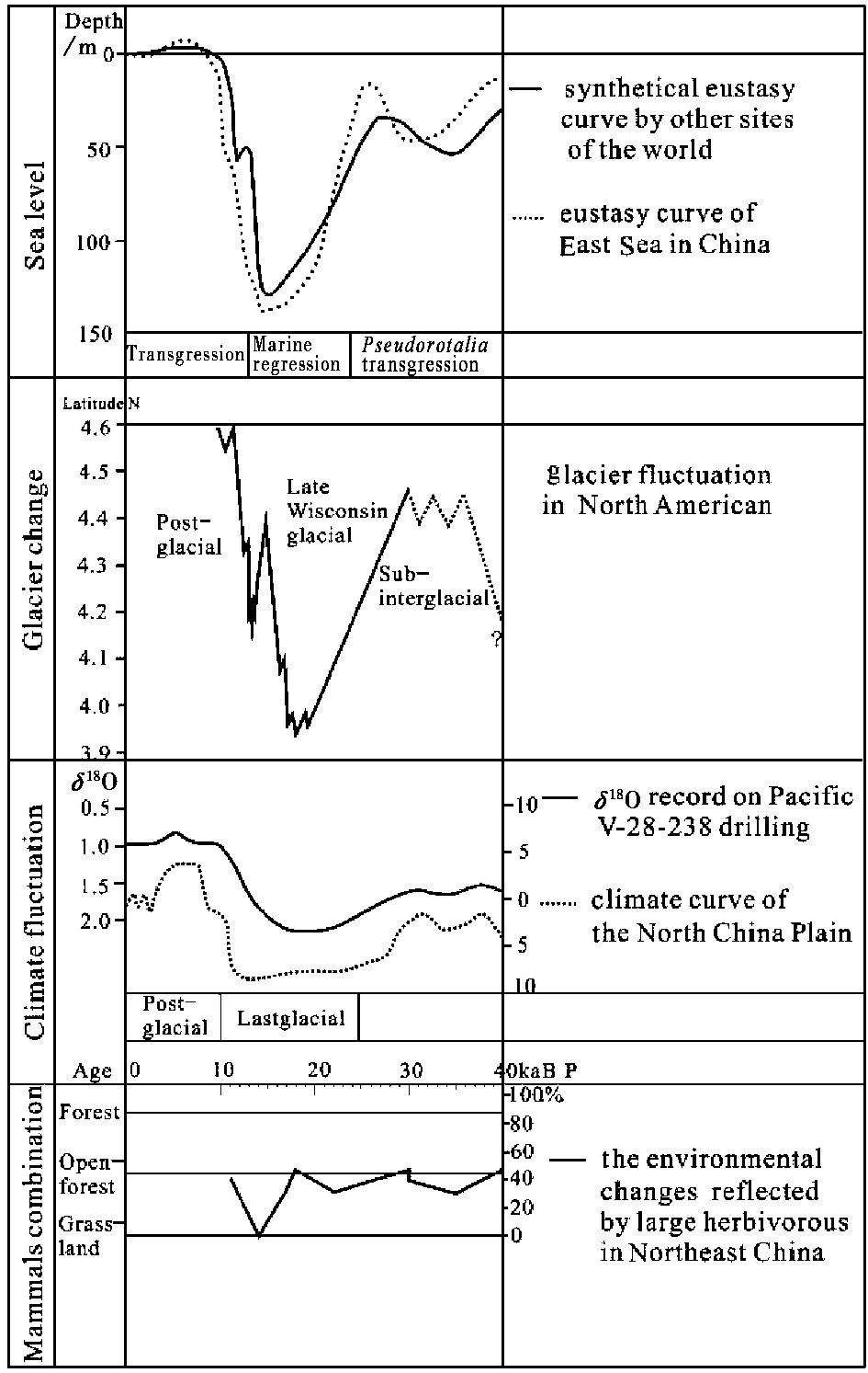 Sites of large herbivores fossils in Northeast China and adjacent areas for the period of 40~10ka B.P.mainly include sites of Guxiangtun (40ka B.P.), Huadian (34.3ka B.P.), Yushu(30ka B.P.), Xiaogushan(30ka B.P.), Yanjiagang(22ka B.P.), Shandingdong(18ka B.P.), Gulongshan(17ka B.P.), Yunlianghe(14ka B.P.)and Qingshantou(11ka B.P.).We analyzed percentages of forest or grassland and recovered climate evolution process of the last glacial(40~10ka B.P.)based on large herbivorous animals.Our record of mammal assemblages is in good comparison with the record of climate change in the North China Plain, with records of global sea level change and glacier fluctuation in North America, and as well as with δ18 O record of Core V-28-238 from the Pacific Ocean(see figure 3).Records of large herbivores from Northeast China for the past 40ka show that this area probably had a frozen tundra background and experienced the subsequent environmental changes: forest grassland at 40ka B.P., open forest grassland at 34.3ka B.P., forests grassland at 30ka B.P., open forest grassland at 22ka B.P., forest grassland at 18ka B.P., open forest grassland at 17ka B.P., tree less prairie at 14ka B.P., open forest grassland at 11ka B.P., and the worst environment in the dry and cold period at about 14ka B.P.This series of changes are comparable to the environmental evolution reflected by three mammalian faunas from the Guanzhong Basin of Shaanxi Province.The only difference between the two regions is that a dry, cold climate and a frozen tundra environment occurred in the Guanzhong Basin(inland)at 17ka B.P., earlier than that in Northeast China(coastal)at about 14ka B.P.It thus indicates that onset of the Last Glacial Maximum environment may have happened with a geographical difference, possibly due to geographically different intensity of the East Asia monsoon.