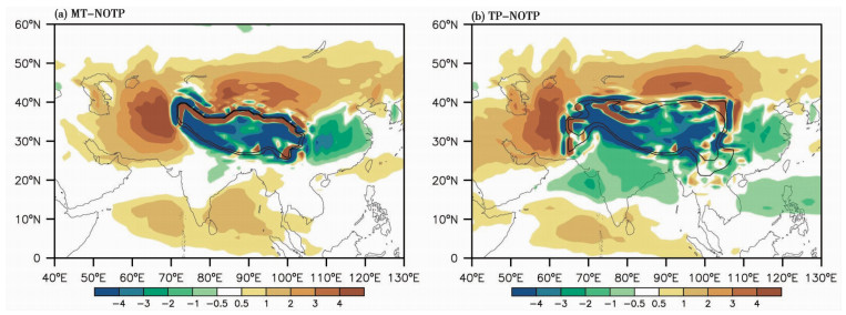图 5 不同试验间模拟的年均500 hPa垂直速度(单位:100 -1 Pa /s)的差异 (a)MT减去NOTP,(b)TP减去NOTP;正值为向下运动,负值为向上运动;外侧和内侧黑色等值线分别代表MT(a)和TP(b)的1000m和2000m Fig. 5 The change of annual vertical velocity at 500 hPa(shaded; units:100 -1 Pa /s) between experiments MT and NOTP (a) and between experiments TP and NOTP(b). Upward motion is negative and downward motion is positive |