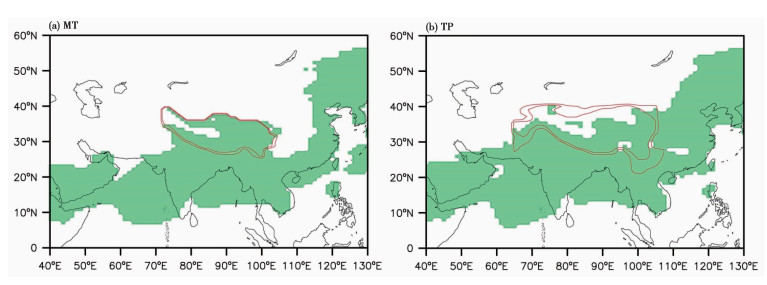 图 6 不同试验模拟的季风区范围(阴影区) (a)MT,(b)TP;季风区定义参照Wang等(2012)[38];外侧和内侧红色等值线分别代表 1000m和2000m Fig. 6 Monsoon domain in experiments MT (a) and TP (b) according to the definition in Wang et al. [38](2012) |
