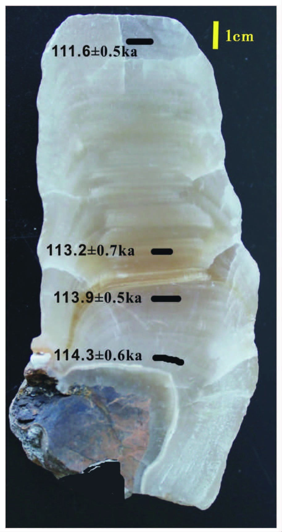 L4样品生长于龙洞底层大厅走廊一侧(距洞口水平距离约500m),采集时已停止生长,高约115mm,外表皮泛黄且有明显的风化薄层。该样品呈柱形平顶状,直径上下均匀,表明其生长沉积期内洞顶滴水稳定。沿生长轴切开,取其一半打磨抛光,肉眼可见清晰水平状生长层。样品自上而下均由纯净碳酸盐方解石组成,岩性致密无溶孔。在距离顶部85~90mm处有一条棕黄色条带。以此条带为界,其上下岩性均为白色( 图 1)。