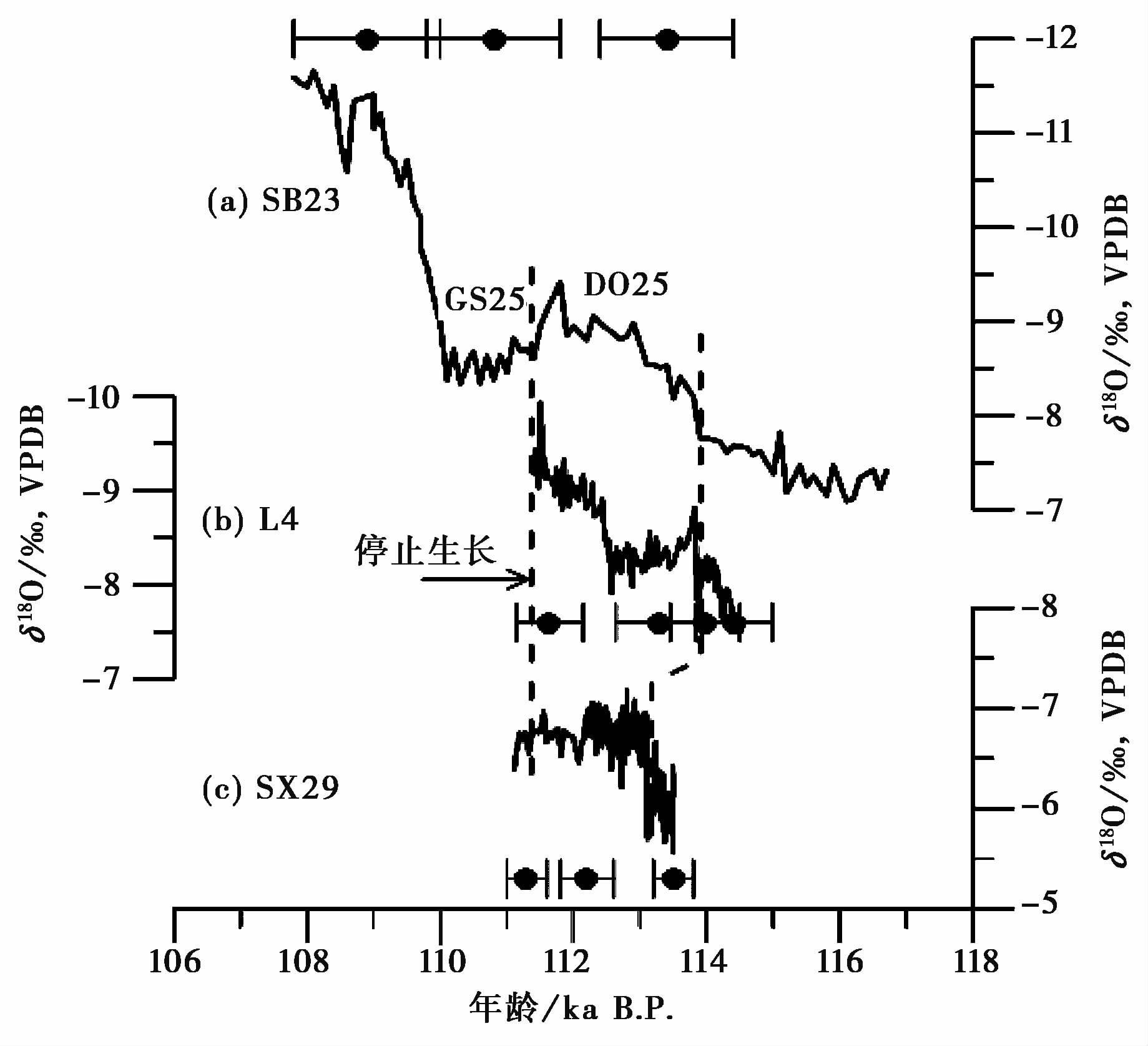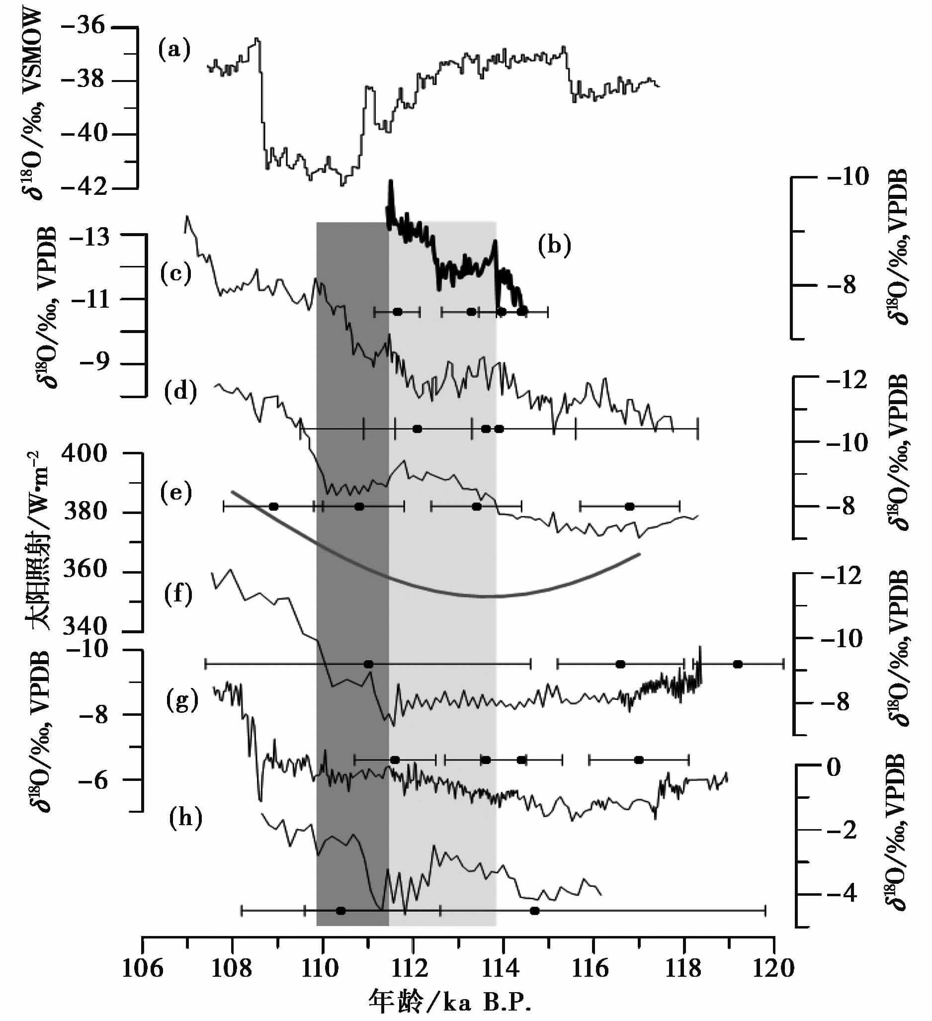 2.3 石笋记录的DO 25事件过去的研究表明: 在千年尺度上,中国石笋 δ 18 O记录具有较好的区域重现性特征[5, 6, 17]。在 图 2和 图 3b中,山西石笋 δ 18 O值在 113.9±0.6ka B .P. 突然偏负1.1 ‰ ,随后持续阶梯式减少,直至石笋L4于 111.3±0.6ka B .P. 停止生长。