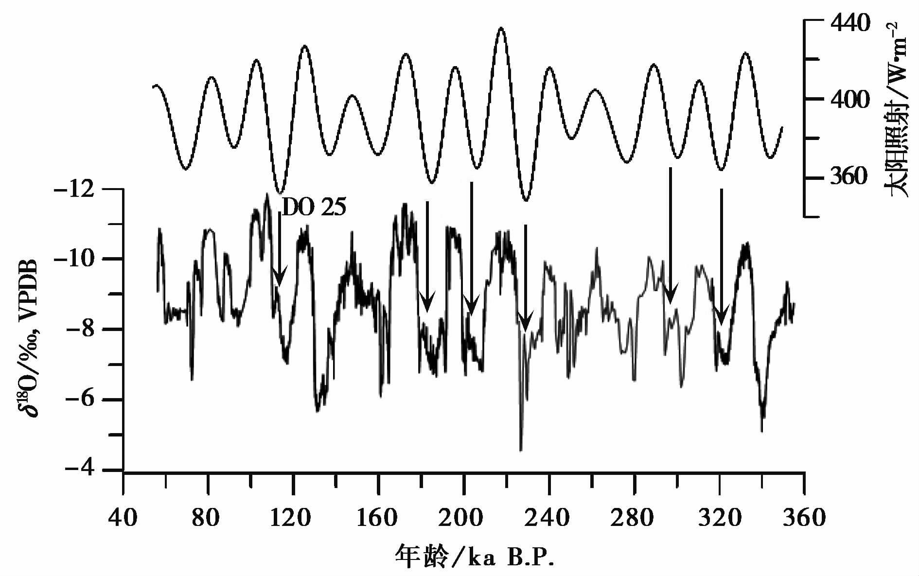 图 4 湖北三宝洞过去36万年石笋氧同位素记录[6]带箭头的垂线表示弱的季风增强事件恰好对应于岁差尺度最低辐照初始上升阶段[33] Fig. 4 The Sanbaoδ 18 O record with Northern Hemisphere summer insolation over the past 360ka B .P.[6, 33] Vertical-lines with arrowheads suggest a series of slightly strengthened monsoon events in the past glacial periods,responding to slightly rising period of the orbital-scale minimum of the insolation |