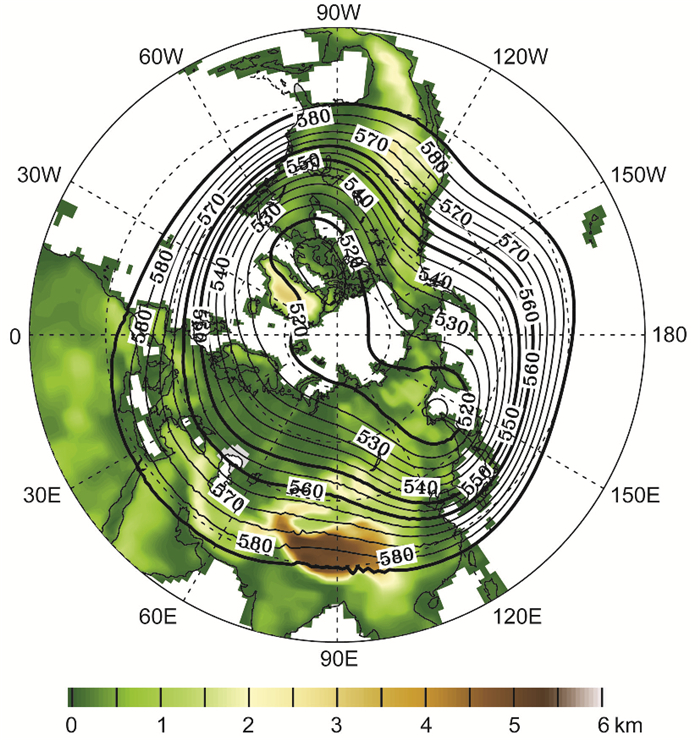 图 1 CAM4模拟的1月500hPa位势高度(等值线,gpm) 填色表示海拔高度(km) Fig. 1 January 500hPa geopotential height simulated with CAM4(contours, gpm). The color shows the elevation(km) |