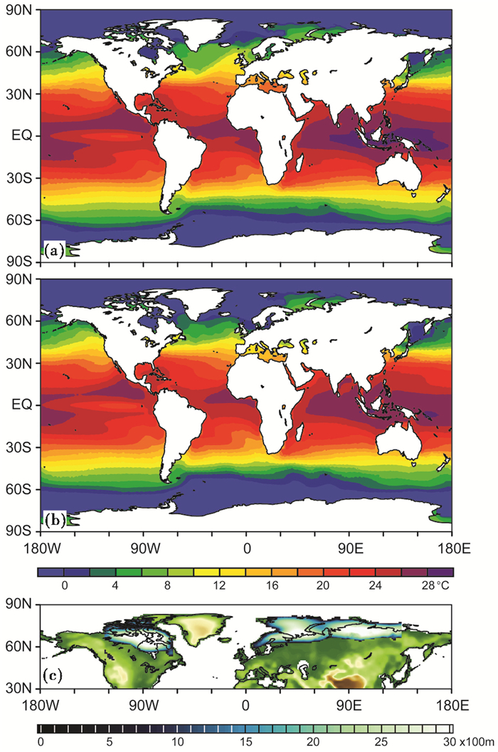 (a)工业革命前海表面温度(℃),(b)理想冰期海表面温度(℃), (c)理想冰期北半球北美-欧亚冰盖厚度异常(蓝白色阶,m) Fig. 2 Boundary conditions. (a)Pre-industrial SST(℃), (b)idealized glacial SST(℃), (c)idealized glacial Northern Hemisphere American-Eurasian ice sheet depth anomalies (blue-white shading, m) |