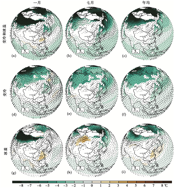 图 3 模拟的800hPa温度(填色,℃)和风场(箭头,m/s)的变化 (a)、(b)和(c),冰盖试验EXP3减去参照试验CON,包括了变冷和冰盖的共同作用;第二行(d)、(e)和(f),变冷试验EXP2减去参照试验CON,显示了变冷的作用;第三行(g)、(h)和(i),冰盖试验EXP3减去变冷试验EXP2,显示了冰盖的作用图中显示的温度变化超过95 %显著性水平 Fig. 3 Simulated changes in 800hPa temperature(shaded, ℃)and winds(arrow, m/s). Upper panel (a), (b)and (c) show the difference between EXP3 and CON, illustrating the impact of global cooling and American-Eurasian ice sheets. Middle panel (d), (e)and (f) show the difference between EXP2 and CON, illustrating the impacts of global cooling. Lower panel (g), (h)and (i) show the difference between EXP3 and EXP2, illustrating the impacts of American-Eurasian ice sheets. Only changes in temperature that are significant at the 95 % confidence level(two-talled unequal t-test)are shown |