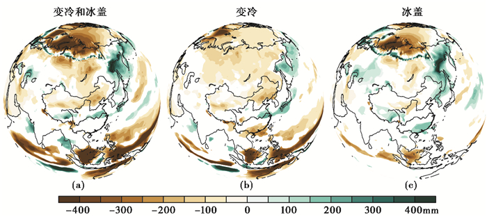 在理想冰期条件下,由地轴倾角和大气CO2浓度改变引起的变冷,也使得我国北方降水显著减少(图 4b)。北美-欧亚冰盖的出现,使得我国内陆尤其是黄土高原区降水进一步减少(图 4c),加剧了这些区域的干旱程度(图 4a)。